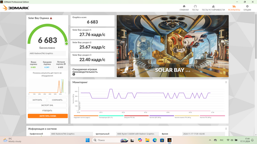 В тесте Solar Bay, где используется трассировка лучей, ноутбук набрал 6 683 балла. Бенчмарк оценил результат, как «баснословно». И не удивительно, ведь результат теста заметно выше среднего результата среди устройств на этой платформе.