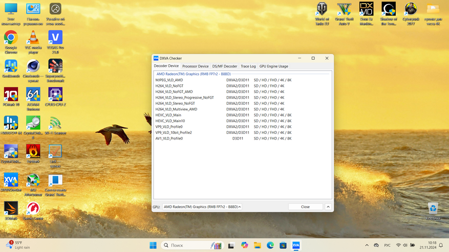 Последний момент касается аппаратной поддержки кодеков. Как видно из DXVA Checker поддерживается декодирование H264 в разрешении до 4К, а HEVC, VP9 и AV1 до 8К. Вы можете возразить, мол зачем, если разрешение экрана 1080p. Но не забываем про HDMI, ведь можно подключить 4К телевизор и смотреть кино на большом экране.
