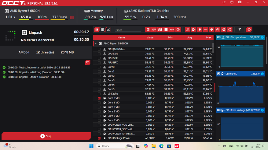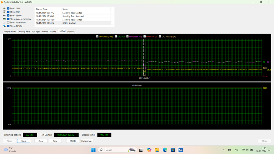 Пауза 1 минута и снова стресс тест, но уже с максимальной нагрузкой CPU + GPU. Т. к тепловой пакет все те же 45W, то вполне понятно, что частота процессора снизится. Утилита показала частоту 3,6 — 3,7 GHz, но вместе с ней упала и температура до 77 — 80 градусов.
