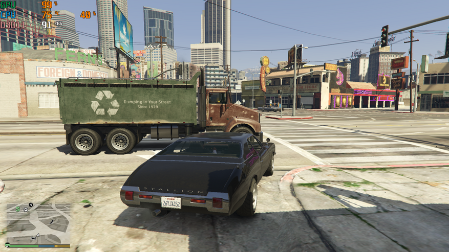 Идем по увеличению нагрузки, поэтому следующая игра GTA5. Да, уже довольно старенькая, но для проверки игровой производительности — идеальная. Здесь также выставил Full HD разрешение, но низкие настройки графики, средний FPS в игре около 90. Можно улучшить настройки до средних, при более чем приемлемом FPS 60+.