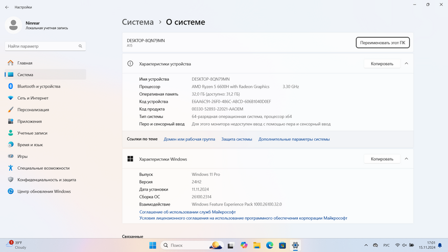 Ninkear A15 Pro поставляется с предустановленной операционной системой Windows 11. Во время тестирования переустановил систему на другой SSD-диск, после чего установил Windows с официального сайта Microsoft и лицензия подтянулась автоматически. Драйвера есть на официальном сайте, в автоматическом режиме определились не все устройства.