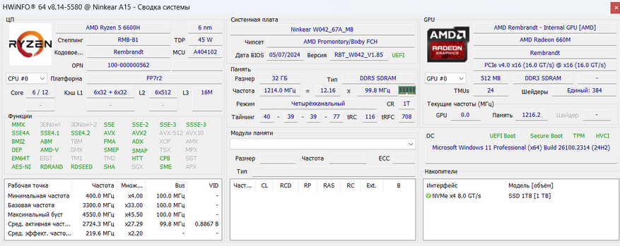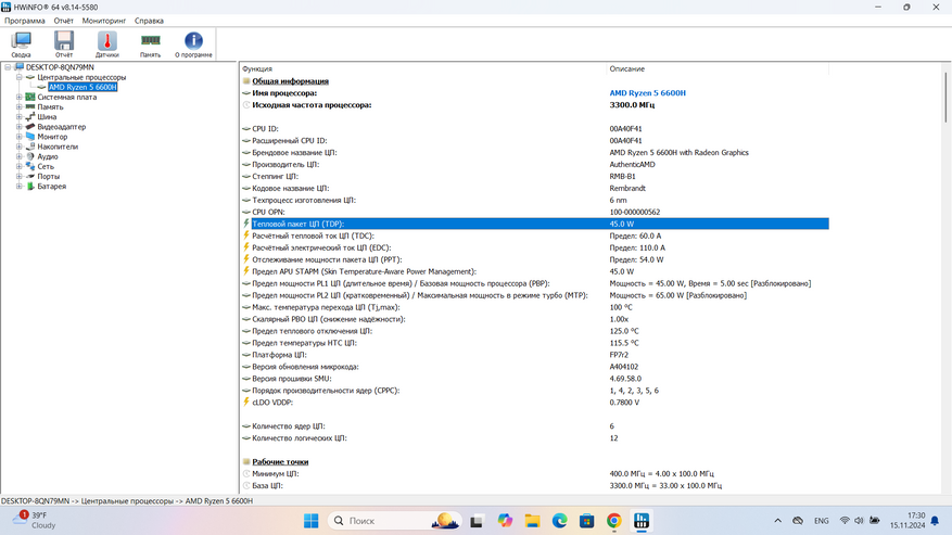 Посмотрим на сводку об аппаратной составляющей. 6 ядерный процессор Ryzen 5 6600H может работать с 12 потоками и достигать частоты 4,5 GHz в максимальном буст режиме. Чипсет базируется на архитектуре Zen 3+ и получил интегрированную графику Radeon 660M, которая в сравнении с предыдущим поколением заметно прибавила в производительности. Также можно отметить тонкий техпроцесс 6 нм, который положительно влияет на энергопотребление и нагрев.