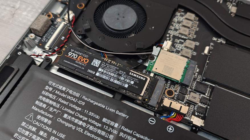 Под левым вентилятором можно заметить еще один разъем под SSD накопитель, а с левой стороны есть стойка под крепление с винтиком. Попробовал установить туда свой Samsung 970 EVO — все нормально работает. Единственный момент, который хочу посоветовать: если планируете ставить второй накопитель, то купите что-то более качественное и используйте его под систему, а комплектный накопитель переставьте во второй слот и используйте как хранилище.