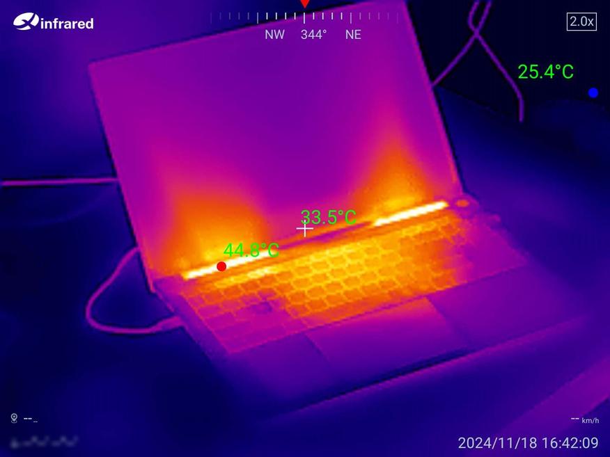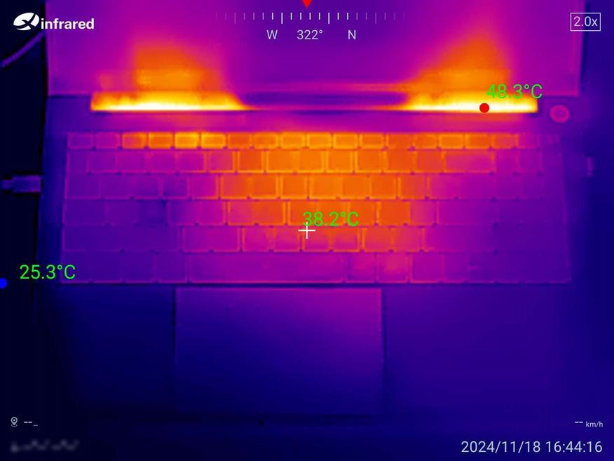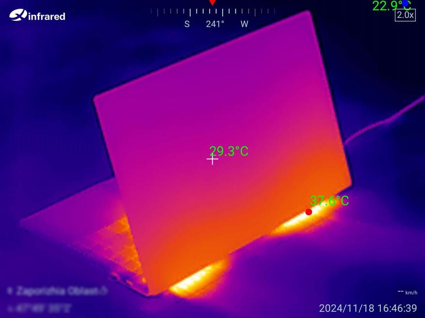 В процессе тестирования сделал термоснимки при помощи тепловизора, чтобы оценить насколько греется корпус и в каких местах. Клавиатура в районе процессора нагрелась до 38 градусов и при касании ощущается теплой, но в целом ноутбук отлично справляется, а горячий воздух выдувается через 2 радиатора в противоположную от пользователя сторону. Опять же, это температуры при стресс тестах, в обычном использовании они будут заметно меньше.
