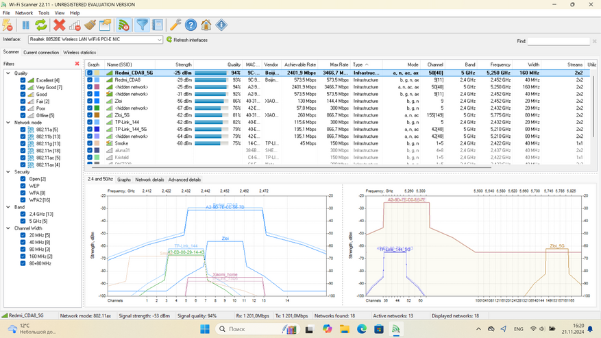 Даже в диапазоне 2,4 GHz, где мои домашние устройства показывают 40 — 45 Mbps, ноутбук выдал почти 300 Mbps на скачивание и 150 Mbps на загрузку.
