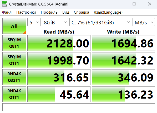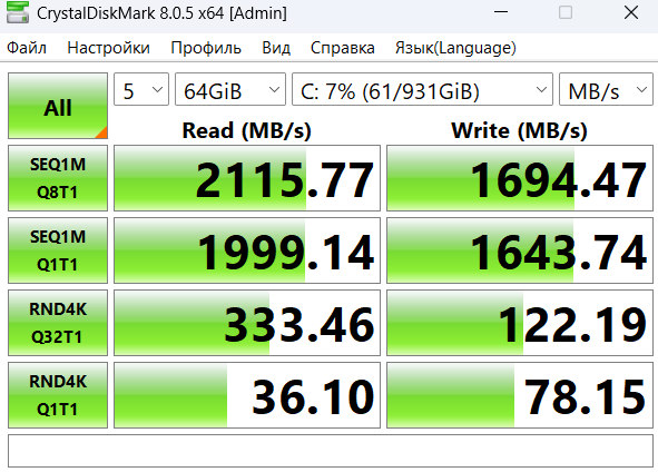 Скоростные показатели весьма приличные: более 2100 MB/s на чтение и около 1700 MB/s на запись в линейных тестах. При работе с большими массивами данных мелких файлов есть снижение производительности, что вполне ожидаемо.
