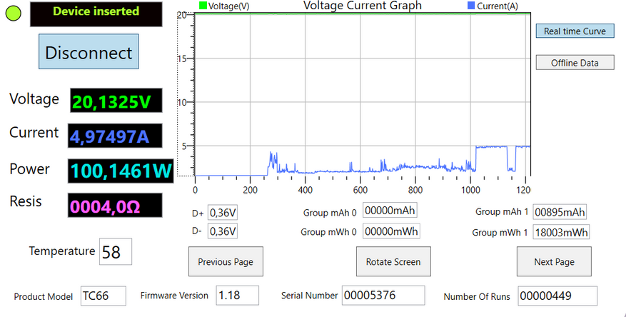 Следующим этапом я проверил сколько потребляет ноутбук под разными видами нагрузки. В рабочем состоянии при легкой нагрузке, вроде чтения браузера ноутбук потребляет 8 — 10W, при воспроизведении ютуба в 4К качестве потребление увеличивается до 18 — 21 W, а во время максимальной нагрузки потребление возрастает до 60 — 68W. Расчетным методом можно прикинуть, что ноутбук способен проработать на аккумуляторе от 1 часа (максимальная нагрузка) до 7 часов (легкая нагрузка, режим чтения). Все тесты проводились с максимальной яркостью экрана, т. е если ее снизить — время работы возрастет. Данные по потреблению брал с тестера в режиме реального времени, отнимая те самые 32W на зарядку. При максимальной нагрузке стресс тестом получил 100W, т. е зарядка действительно может работать на полную мощность. На всякий случай проверил потребление на более мощной 140W зарядке, но больше 100W потребление все равно не поднималось.
