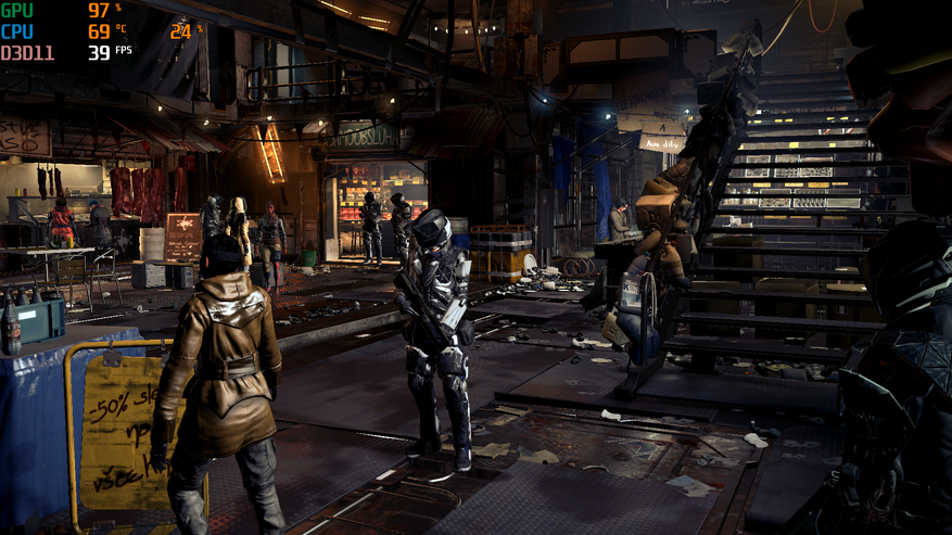 Продолжаем наращивать обороты. Более требовательная к графике игра Deus Ex: Mankind divided в разрешении 1080P с пресетом «низкие» выдала средние 40 FPS.