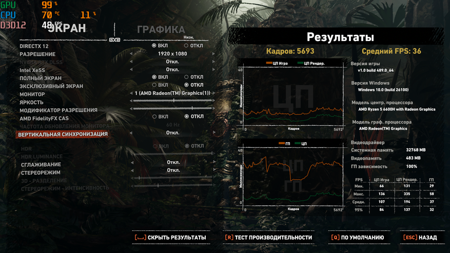 Для того, чтобы поиграть в Shadow of the Tomb Raider с разрешением Full HD пришлось также снизить настройки до низких и даже слегка уменьшить модификатор разрешения, но в итоге средние 36 FPS на встройке это что-то из разряда фантастики.