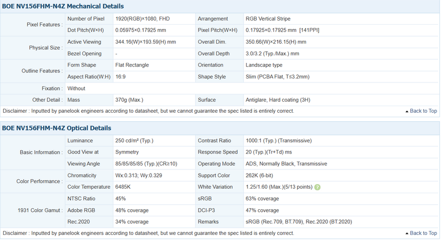 Согласно даташиту это 6 битная панель с цветовым охватом 63% sRGB и типичной максимальной яркостью 250 нит.