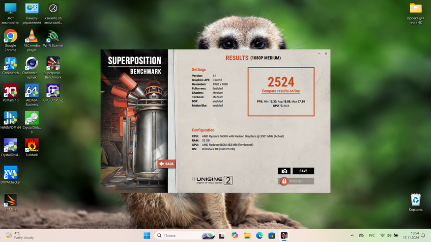 Ну и для разнообразия еще один популярный графический тест под названием Superposition — 2524 балла.