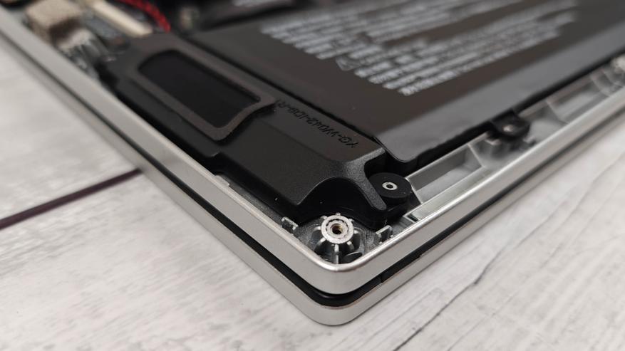 В целом за качество сборки и расположение элементов могу только похвалить. Есть продуманные моменты, которые влияют на общее ощущение от ноутбука. Например, стерео динамики, которые расположены по бокам. Они крепятся к корпусу через демпфирующие прокладки, которые поглощают вибрации и дребезжание.