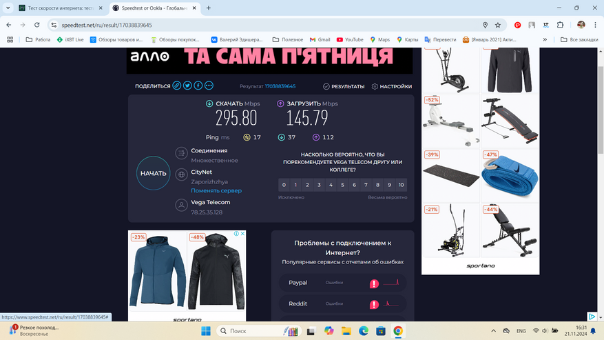 В этом разделе я опишу повседневные, но очень важные вещи, вроде впечатления от просмотра видео или тестирования скорости интернета. Кстати, о интернете. Т. к проводное подключение не предусмотрено, то очень важно, чтобы WiFi модуль был быстрым и чувствительным. И ноутбук не подкачал. Здесь есть WiFi 6 с поддержкой стандарта 802.11 АХ, и что не менее важно — чувствительная антенна, которая ловит уверенный сигнал даже на значительном удалении от роутера.