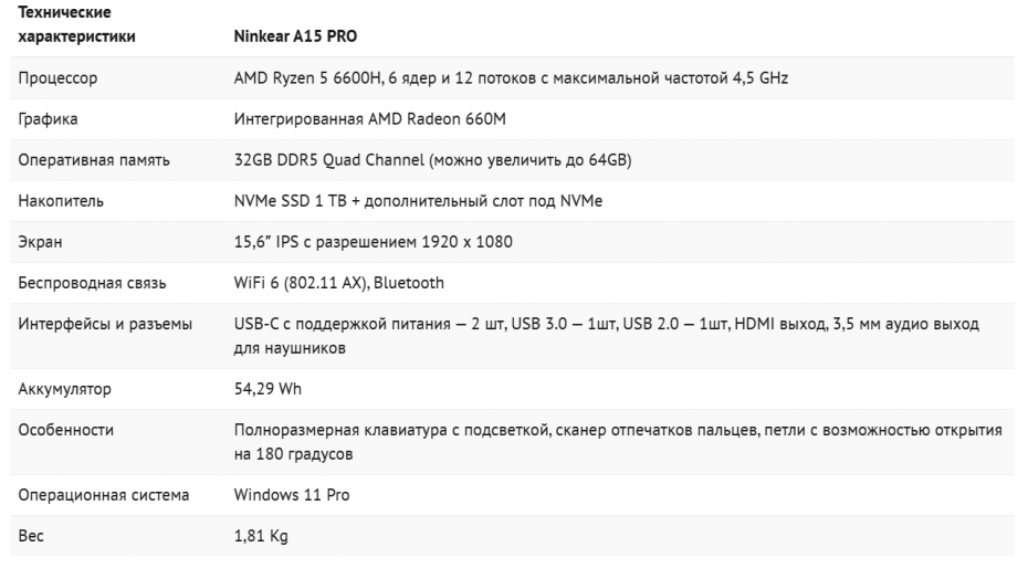 Ninkear A15 Pro это универсальный производительный ноутбук, который справится с любыми поставленными задачами, будь то рабочие вопросы, повседневные домашние дела или развлечения. Процессор Ryzen 5 6600H сильно прибавил по сравнению с предыдущим поколением и помимо хорошей многопоточной производительности получил продвинутую интегрированную графику. Да, ноутбук даже позволяет поиграть в современные игры в разрешении Full HD, хоть настройки чаще всего придется выбирать низкие. Что вполне естественно, ведь перед нами не геймерское решение. Что касается памяти, то здесь установлена современная DDR5 память работающая в четырехканальном режиме, да и объема 32 GB будет достаточно для любых задач. Накопитель также не подкачал — NVMe SSD объемом 1 TB с возможностью установить еще один, если этого будет недостаточно. Наиболее слабым местом, пожалуй, является дисплей с 6 битной матрицей. Это хоть и IPS, но довольно бюджетный. А вот автономность очень порадовала, если уменьшить яркость до средних значений, то заряда хватит на весь рабочий день. Также отмечу металлический корпус, удобную клавиатуру с подсветкой и сканер отпечатков пальцев, позволяющий защитить ноутбук от несанкционированного доступа. Ну и как вишенка на торте — продуманная система охлаждения, которая позволяет работать на полную мощность и не «ронять» производительность от перегрева.