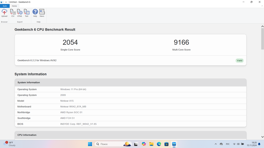Ну, а теперь пришла пора протестировать производительность всей системы и начнем с процессорных тестов. В Geekbench 6 набрал 2054 балла в режиме одного ядра и 9166 баллов в многоядерном режиме. В Open CL тесте ноутбук набрал 15456 баллов.