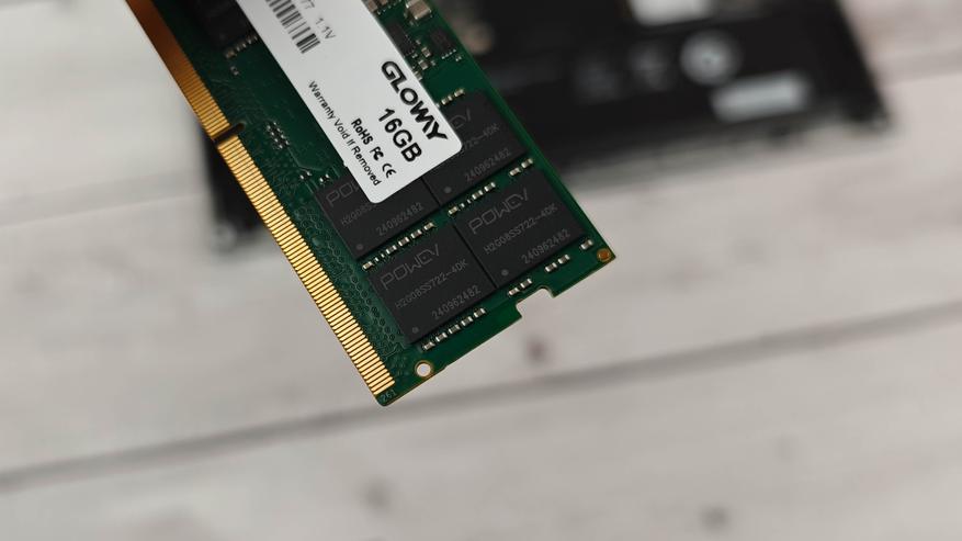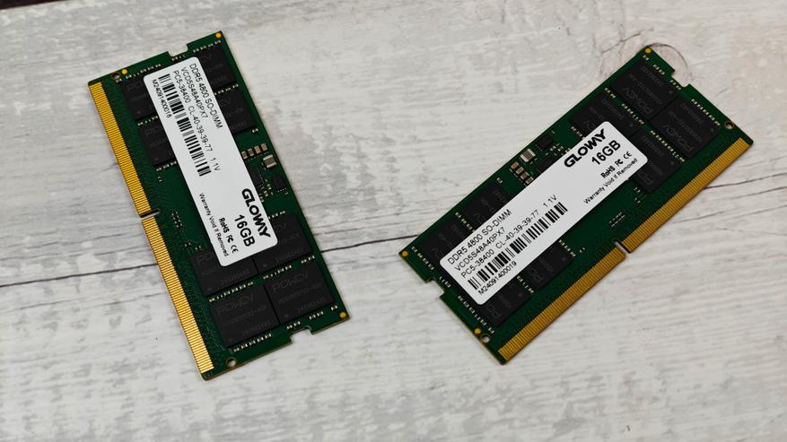 2 планки DDR5 оперативной памяти Glowy по 16 Gb, чипы промаркированы как POWCV H2G08SS772 (если правильно разобрал).