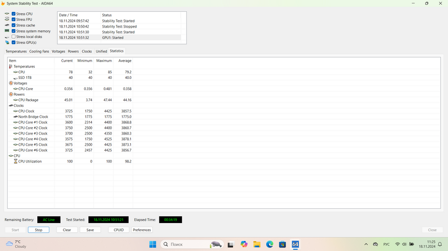 Если посмотреть в статистику, то можно увидеть, что максимальная температура зафиксированная на процессоре была 85 градусов. Это в момент старта максимальной нагрузки. Потом начинают работать вентиляторы и температура падает. Кстати, в спокойном рабочем режиме, когда вы пользуетесь браузером или смотрите видео, температура процессора находится в пределах 40 градусов, при более активном использовании обычно не превышает 60, в играх возростает до 80 градусов. Напомню, что Tjmax процессора (температура при которой начинается троттлинг) составляет 100° С, т. е запас весьма приличный.
