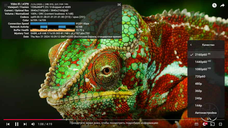 В Youtube доступно качество 4К\60 fps, воспроизведение плавное, без дропов.