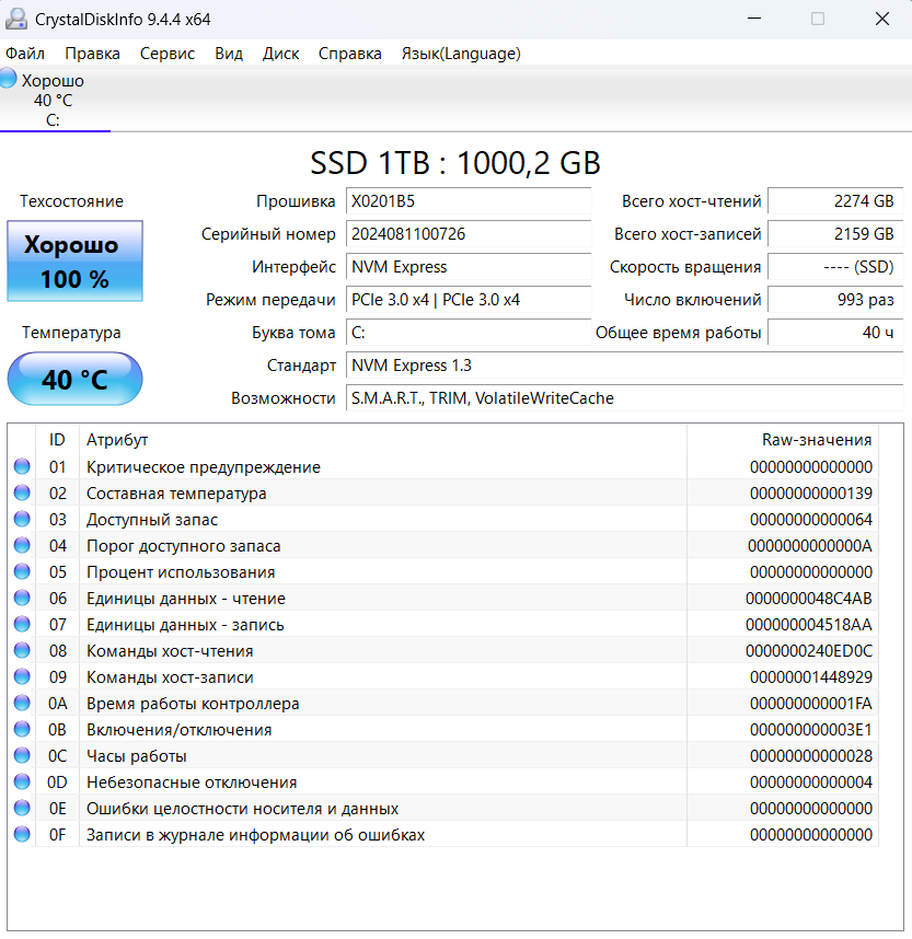 Начнем с накопителя. Как видим реальный режим передачи данных PCIe 3.0 x 4, что несомненно радует. Показатели SMART в норме, а вот температурного датчика нет (всегда показывает 40 градусов).