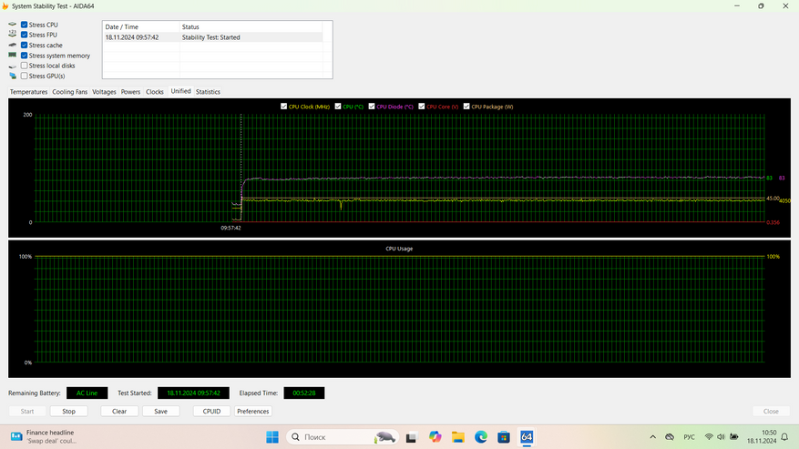 Пока проводил различные тесты, запускал бенчмарки и играл в игры, понял, что ноутбук получил шикарную систему охлаждения, которая очень правильно настроена и отлично справляется со своими задачами. При простых действиях, вроде чтения интернет страничек, работы в текстовом редакторе или воспроизведении видео система охлаждения чаще всего вообще не работает. Т. е пассивного рассеивания тепла по медным трубкам вполне достаточно, чтобы ноутбук оставался холодным и бесшумным. Если все же нагрузка увеличивается, то ноутбук начинает с малых (едва слышных) оборотов, наращивая их по мере возрастания температуры процессора. Но даже на максимальных оборотах (например, в играх) звук вращения вентиляторов не противный завывающий, а скорее мягкий шелестящий. Хорошие тихие кулеры это уже успех, а правильная адекватная реакция на нагрев это уже мастерство. Такая система охлаждения позволяет лучше раскрыть производительность процессора и графики, при этом не раздражая неприятным шумом пользователя. Ну, а теперь собственно и сами стресс тесты. Причем не на 10 минут, а прям по полной. Сперва час погонял процессор в Aida 64: температура держится в районе 83 градусов, тепловой пакет 45W, частота процессора около 4 GHz.