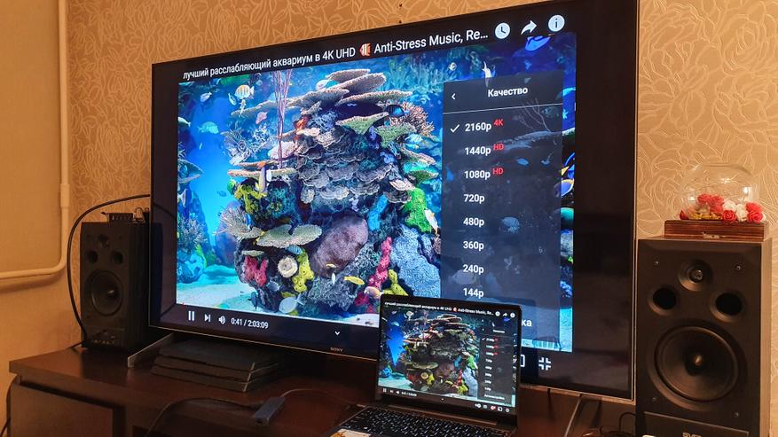 Ну и конечно же возможность вывода изображения на большой экран. Вы можете подключить свой ноутбук к большому телевизору и смотреть видео или играть (если позволяет железо) в разрешении 4К/60 fps. А можно использовать телевизор в качестве монитора для работы.