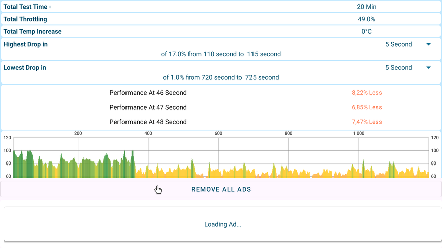 Более серьезная нагрузка от CPU Slowdown (настоящий кошмар тв-боксов) показала, что при постоянной 100% нагрузке на процессор, он все же скидывает производительность. Примерно через 6 минут такой нагрузки производительность заметно снижается и в среднем выдает 49% от максимальной возможной. Но получить такую нагрузку в реальных условиях использования не реально. При воспроизведении тяжелых 4К фильмов через Torrserve или просмотре IPTV, процессор даже близко не получает таких нагрузок, ведь декодирование видео происходит на аппаратном уровне. По сути вся мощность процессора используется лишь для работы системы и запуска приложений. Да, использовав радиатор мы не получили бы такого падения в бенчмарке, но к реальным сценариям применения это никакого отношения не имеет.