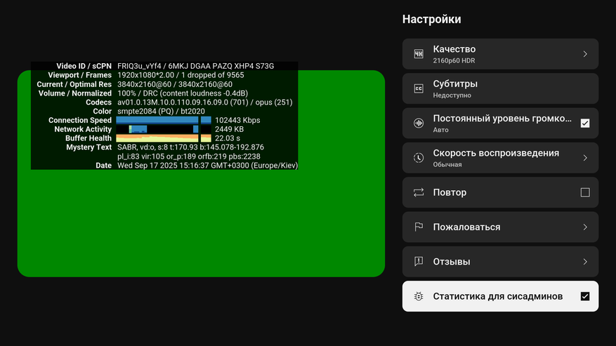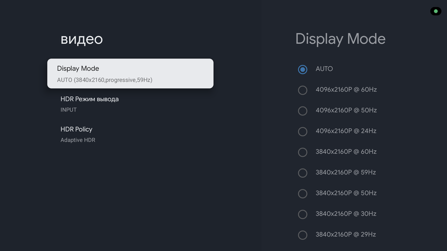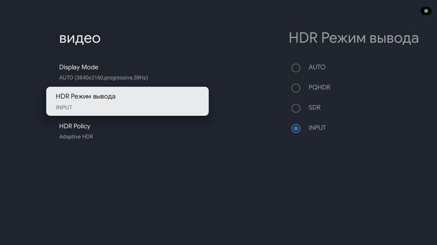 Что касается HDR форматов, то есть поддержка HDR10, HDR10+ и HLG. Приставка может работать в 3 режимах: PQHDR с улучшением изображения при помощи ИИ (HDR будет на постоянном режиме), в режиме SDR и в режиме Input, когда приставка будет включать режим вывода изображения в зависимости от воспроизводимого контента. Т. е фактически здесь присутствует адаптивный HDR, что подтверждает следующий пункт в настройках.