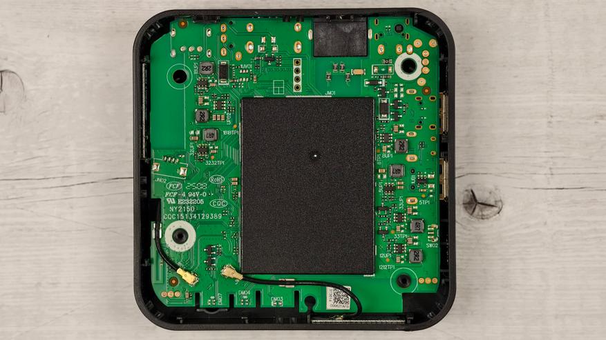 Разбирается устройство и сложно и просто одновременно. Просто в том смысле, что крышка держится только на защелках. Но защелки такие плотные, что при вскрытии я изрядно помучался и даже сломал пластиковую карту. На материнской плате видим подключение раздельных WiFi антенн и крупный металлический экран, за которым разместили основные компоненты.