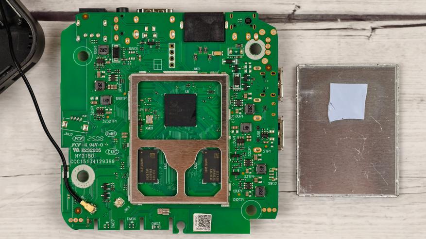 Снимаем экран и видим процессор, а также два чипа оперативной памяти. Охлаждение минимальное, на процессор не установили даже крохотный радиатор. Все, что ему доступно для отведения избыточного тепла, это тот самый металлический экран с которым он контачит через термопрокладку.