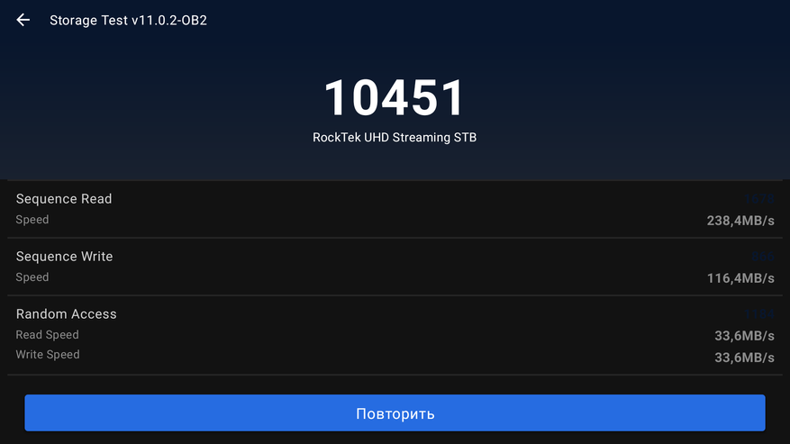 Была проверена скорость внутреннего накопителя: чтение 116 MB/s, запись 238 MB/s.