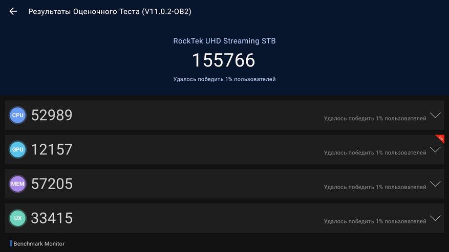 Пройдемся по популярным тестам. Недавно вышла новая версия Antutu (одиннадцатая) и в алгоритмах теста снова произошли существенные изменения, так что сравнивать с прошлой (десятой) версией не выйдет. Но ради интереса я провел тест и получил 156 000 баллов. В будущем можно будет сравнить с другими приставками.