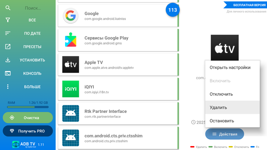 При первом включении также увидите несколько предустановленных приложений: Prime Video, iQITY, Apple TV, Youtube Music и Netflix. Стандартными методами эти приложение из системы не удаляется и засоряют экран своими бесполезными рекомендациями. Удалить ненужные можно при помощи бесплатного приложения ADB TV (с маркета). Также рекомендую установить CX Проводник, с помощью можно установить приложения, которых нет в официальном магазине. Скачиваете на компьютер нужные APK файлы и закидываете их в приложении по сети на приставку. Разумеется можно и просто закинуть на флешку, после чего установить с файлового менеджера.