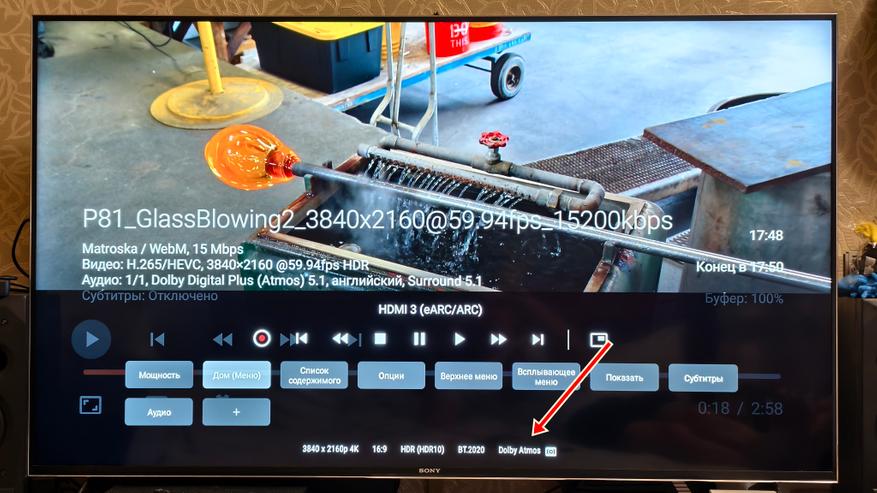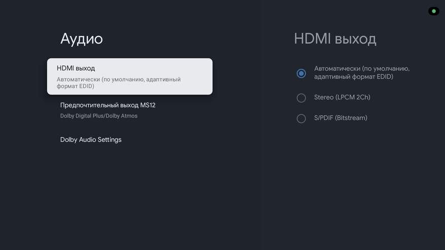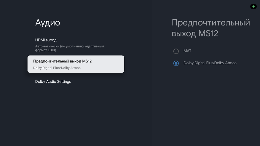 Здесь правда пришлось покопаться в настройках, так как мой телевизор упорно не хотел включаться в режиме Dolby Atmos и настойчиво предлагал Dolby Digital+. И только когда я поменял настройки в разделе «Предпочтительный выход MS12», я наконец-то увидел долгожданную плашку, подтверждающую активацию звука Dolby Atmos.