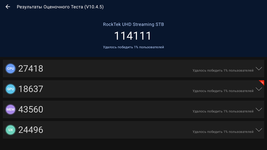 Также я скачал Antutu 10, чтобы сравнить с результатами тестирования других популярных приставок. Здесь получил 114 000 баллов. RockTek GX1 на этом же процессоре, но с вдвое большим объемом памяти набрал 119 000 баллов, а KINHANK G1 на Amlogic S905X4 набрал 129 000. Один из главных конкурентов, Xiaomi TV Box S 3rd Gen набрал немного больше — 140 000 баллов. Т. е как видим эти модели плюс-минус равны в своих вычислительных способностях. По крайней мере сказать, что какая-то из этих приставок заметно мощнее — я не могу. Все справляются хорошо, интерфейсы системы не тормозят, а приложения открываются достаточно быстро.