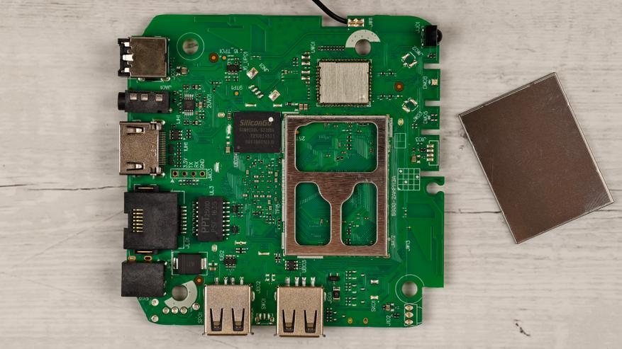 С противоположной стороны также металлический экран, но под ним ничего не оказалось. Слева от него чип eMMC памяти SiliconGo S32BBG на 32 GB, а выше разместили WiFi модуль (без опознавательных знаков).