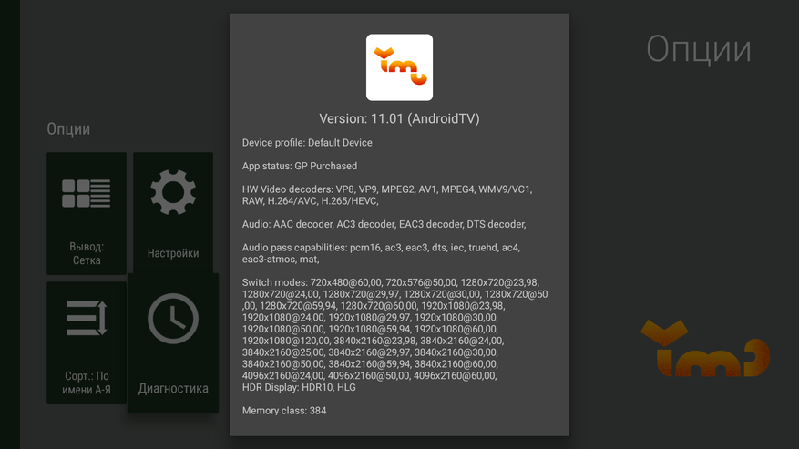 Но это можно увидеть в специализированных утилитах, либо в разделе диагностики Vimu плеера. Для 4К разрешения доступна поддержка следующих частот: 23,98\24\25\29.97\30\50\59,94\60 Hz.