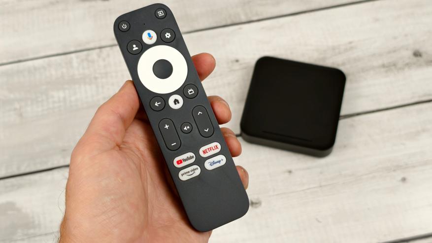 Для управления приставкой предлагают использовать компактный G10: без цифрового блока и с дополнительными кнопками ярлыками. Есть приложения, которые позволяют переназначить эти кнопки на запуск любых приложений, так что на надписи внимание не обращайте. Пульт работает через Bluetooth, но есть и дополнительный ИК передатчик для управления телевизором или ресивером. Кнопки нажимаются с четким, но приглушенным кликом. Пульт очень распространенный и пожалуй лучший среди «компактов» на сегодняшний день.