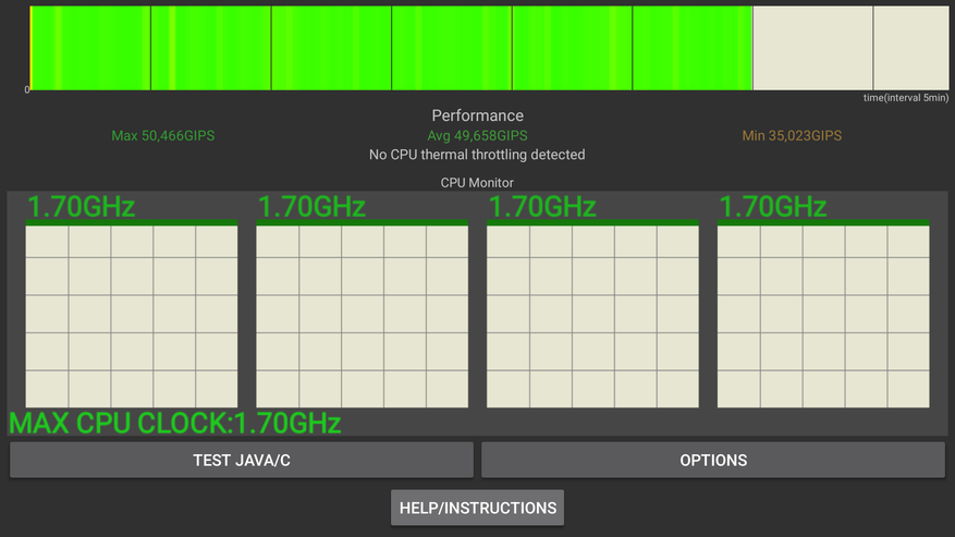 Помимо производительности было интересно провести стресс тесты и посмотреть как приставка поведет себя под тяжелой нагрузкой с учетом того, что у нее фактически отсутствует система охлаждения. 30 минутный троттлинг тест (100 потоков) показал 49,658 GIPS в среднем и ровный зеленый график, подтверждающий отсутствие троттлинга. Для примера, старшая модель RockTek GX1, где установлена более серьезная СО (крупная металлическая пластина), показал точно такие же результаты — 48,619 GIPS.