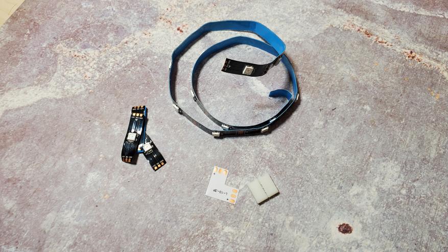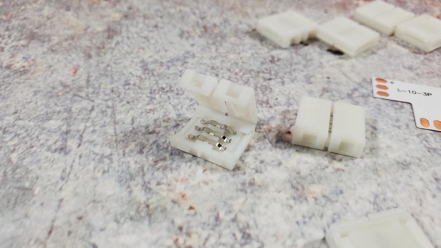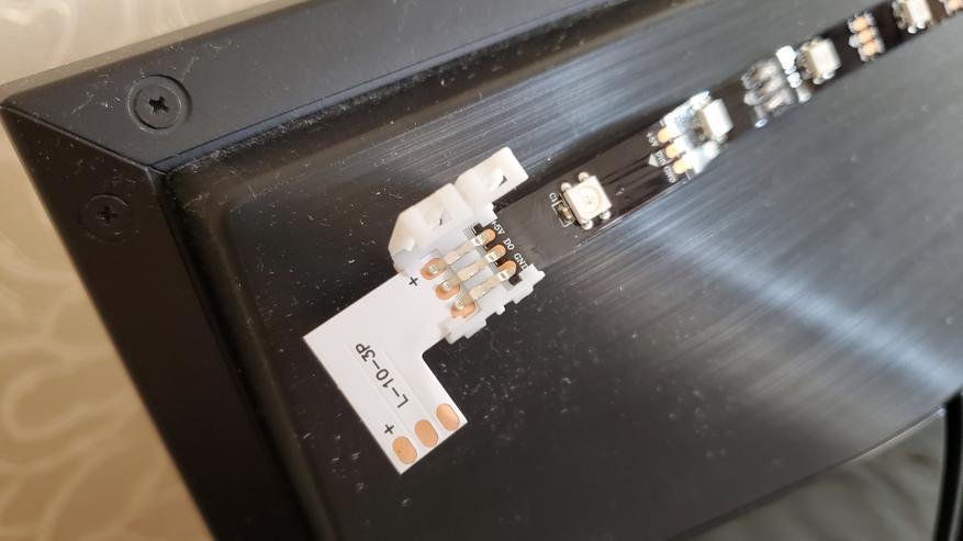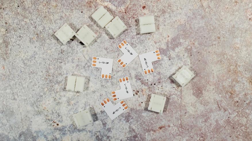 Для монтажа есть коннекторы, позволяющие соединить 2 куска ленты и уголки, которые позволяют повторить контур телевизора, обеспечивая поворот на 90 градусов.