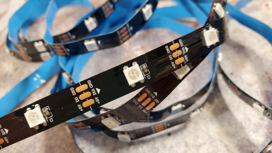 С обратной стороны ленты есть клейкая основа для монтажа, в общем тут она ничем не отличается от обычной ленты для освещения. Можем рассмотреть светодиод и дорожки. Дорожки подписаны (питание 5V, для передачи данных и земля). При монтаже нужно быть внимательным и соблюдать полярность.