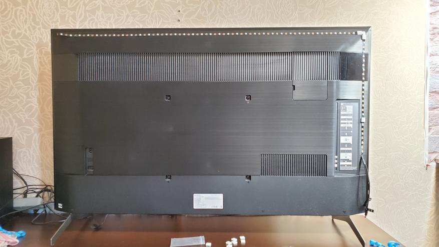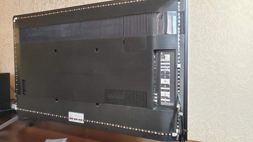 Уже после того как начал пользоваться, решил немного переделать схему. Как вы могли видеть, мой телевизор не висит на стене, а стоит на тумбе. При этом у него достаточно низкие ножки. При работе лента давала на тумбу засвет и мне это не понравилось. В итоге я решил убрать нижнюю часть и оставить подсветку в виде буквы П (по трем сторонам: по бокам и сверху). Если телевизор висит на стене, то тогда конечно лучше будет по всем 4 сторонам. Но на тумбе мне больше понравился вариант с 3 сторонами. В плане погружения это конечно хуже, но паразитные засветы все равно отвлекают сильней. На следующих снимках вы уже увидите работу после переделки.