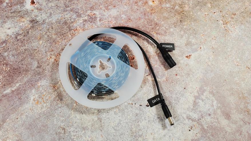 Рассмотрим все в поближе. Светодиодная лента намотана на бобину и имеет два разъема для подключения: питание (Power) и передача данных (DATA).