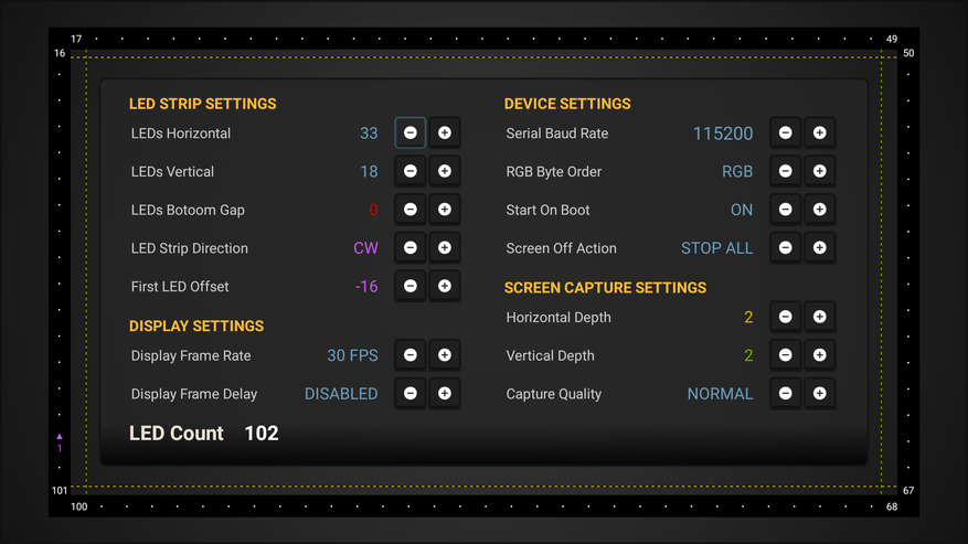 Также перед использованием следует установить некоторые базовые настройки. Это даст более точное отображение эффектов по зонам. Для этого считаем физическое количество светодиодов по вертикали и горизонтали и выбираем соответствующее значение в LEDs horizontal и LEDs vertical. Также стоит указать местоположение первого светодиода (First LED offcet). Здесь же можно найти и такие настройки, как частота кадров в секунду, автозагрузку, глубину захвата, качество и некоторые другие моменты.