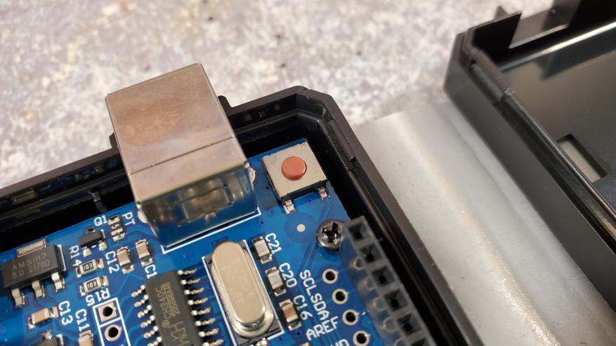 Внутри обнаружил непонятную кнопку, скорее всего для сброса. В соответствующем месте в корпусе есть отверстие, но оно прикрыто наклейкой.