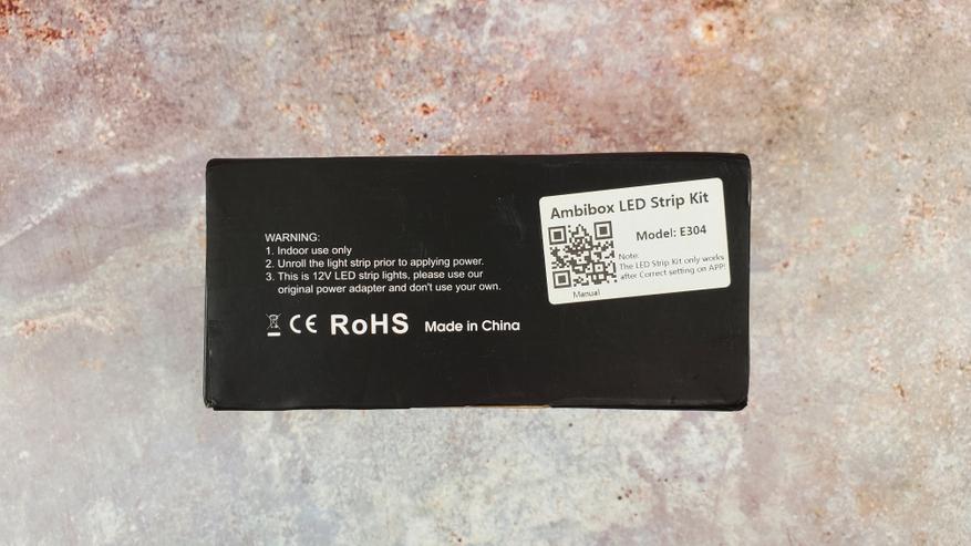 Единственная наклейка говорит о том, что это Ambibox LED Strip Kit, модель E304. В описании товара можно найти информацию, что лента использует светодиоды SMD 5050 RGB. Это сразу дает понимание того, что чисто белого цвета здесь нет, т. к он достигается путем смешения нескольких цветов из-за чего имеет оттенок. Но т. к это фоновое освещение, то в принципе не столь важно.