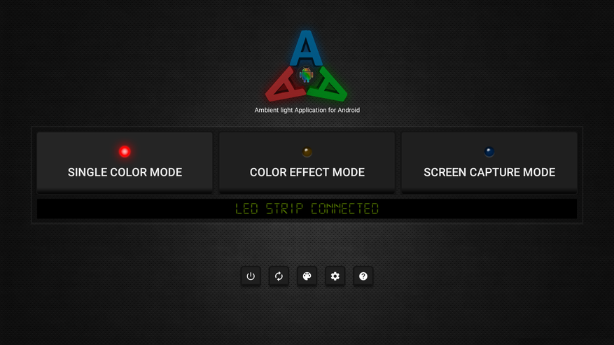 И попадаем на главный экран. Должен быть статус «LED STRIP CONNECTED». На главном экране можно переключать режимы работы: