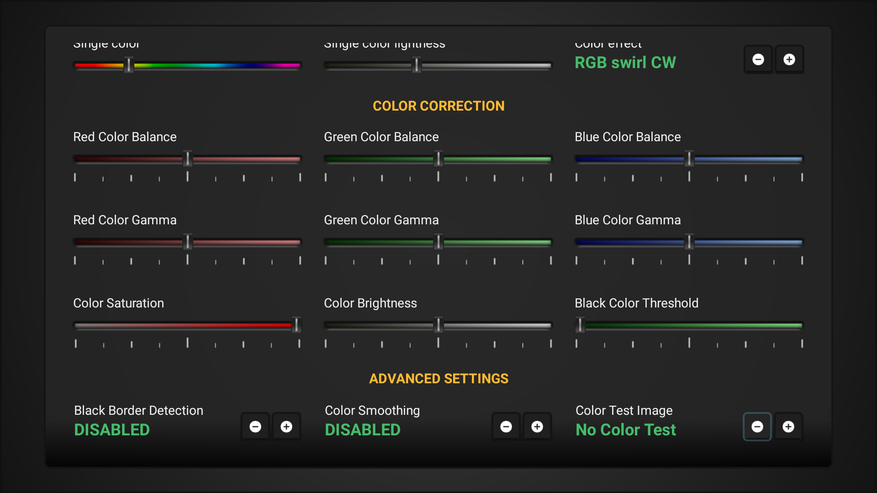В расширенных настройках можно включить определение черных полей (чтобы лента корректно работала с фильмами, которые имеют черные поля сверху и снизу). Здесь же можно запустить тест для проверки совпадения по цвету.