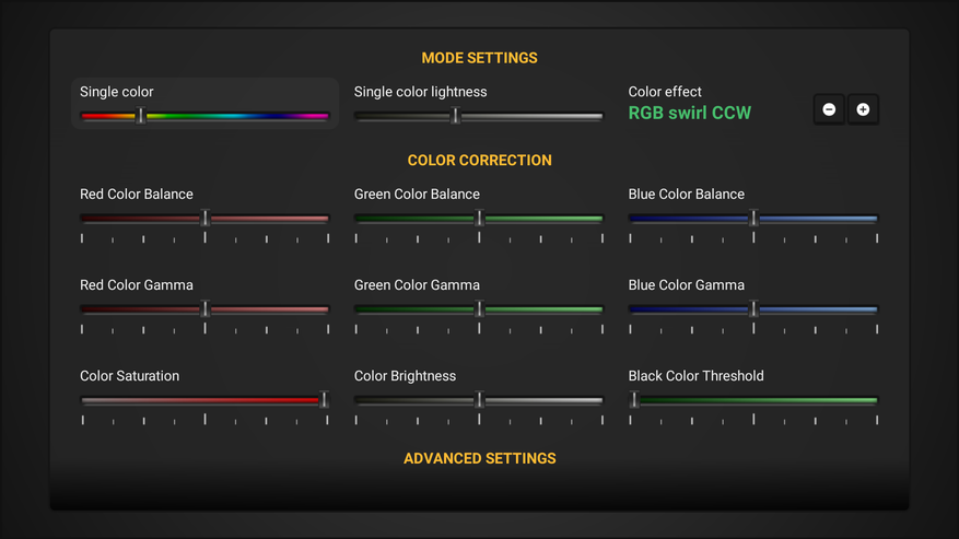 Также есть дополнительные экраны. Первый имеет иконку палитры и здесь можно подкорректировать цвета, а также выбрать цвет в режиме single color или эффект в режиме color effect.