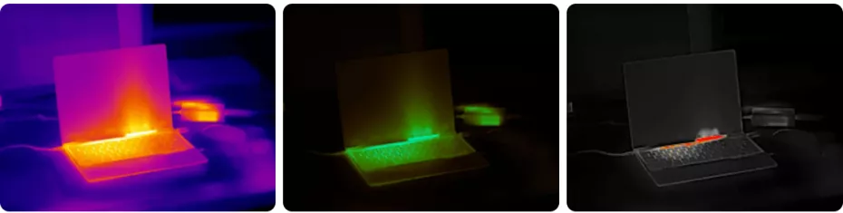 Теперь посмотрим как тепловизор показывает нагрев различных устройств. Например, дешевый нетбук Chuwi греется под клавиатурой. Видно, что отвод охлаждения реализован не слишком грамотно и горячий воздух частично попадает на лицевую часть экрана. Также видно, что греется блок питания, который находится рядом.