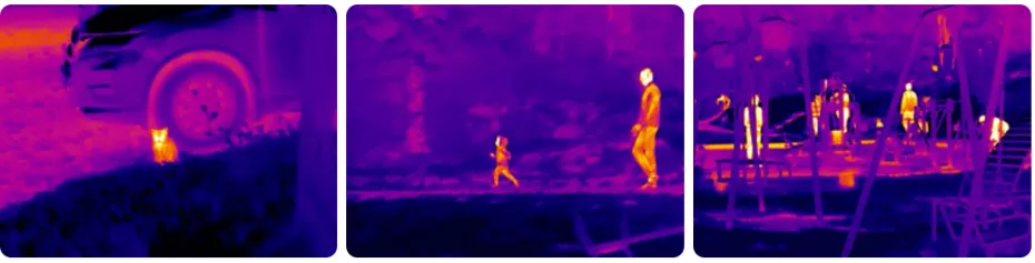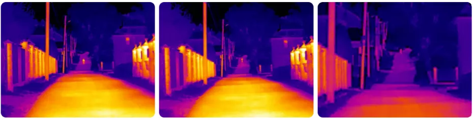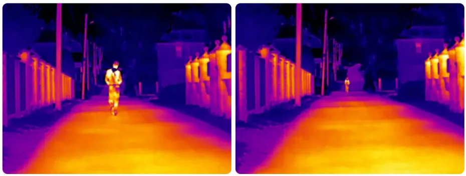Ну и напоследок я провел небольшой эксперимент, касающийся дальности обнаружения. Я попросил сына пройтись по дороге (в темноте) и периодически делал снимки на тепловизор.